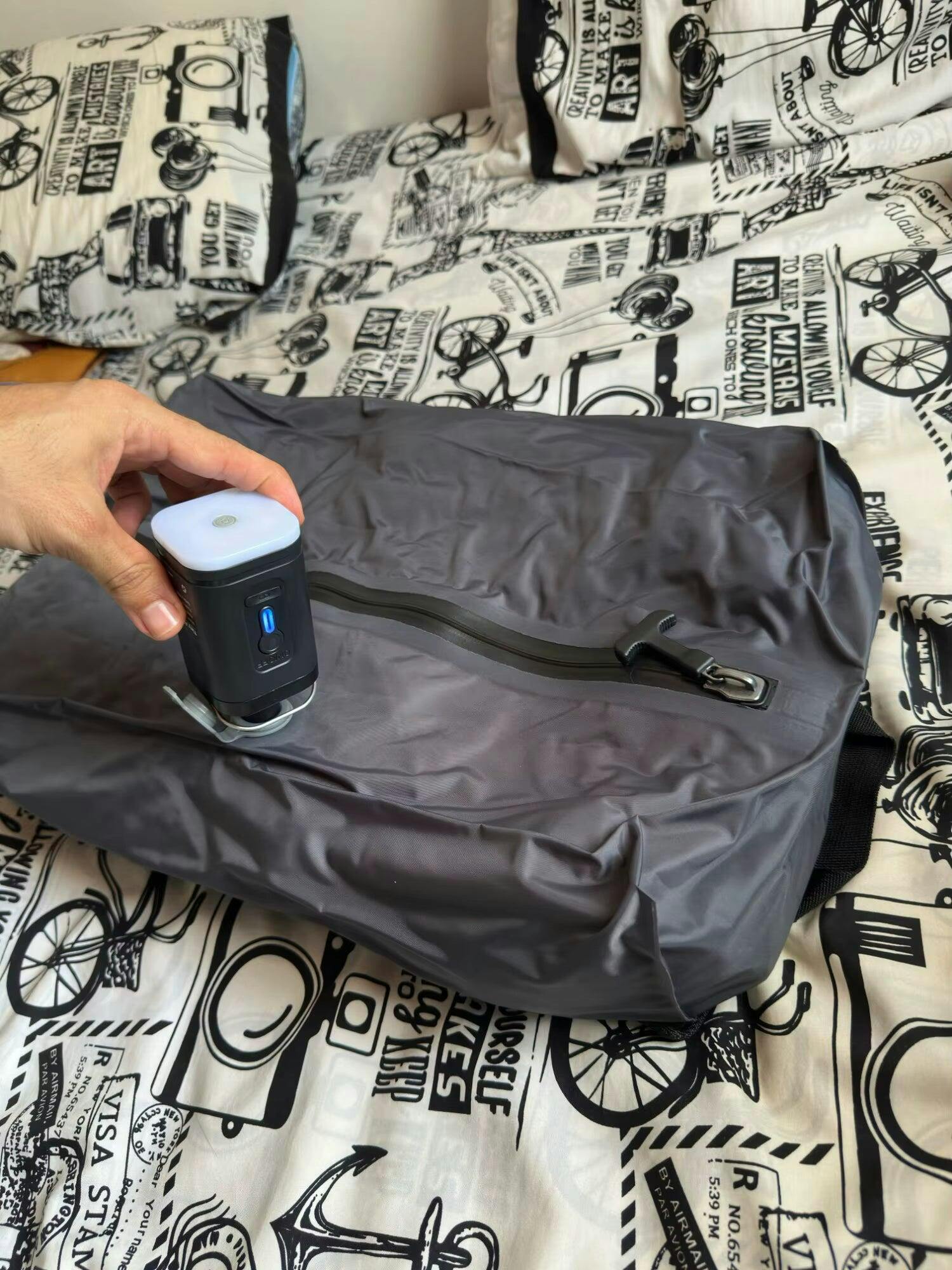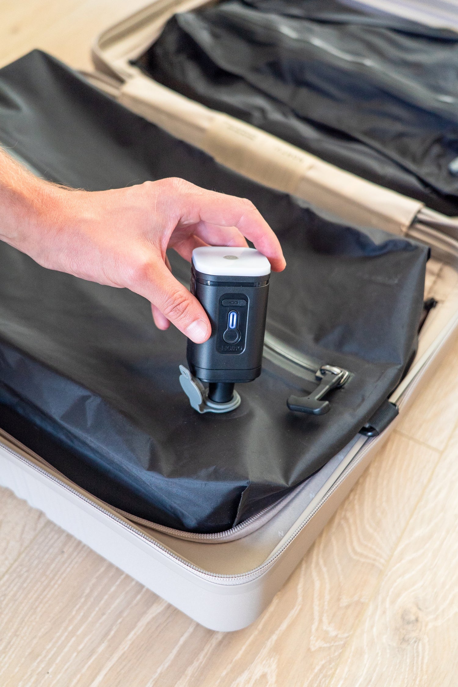 La Bomba de Aire portátil 2PackBags™ es recargable mediante USB-C y ofrece 15 usos con una sola carga.